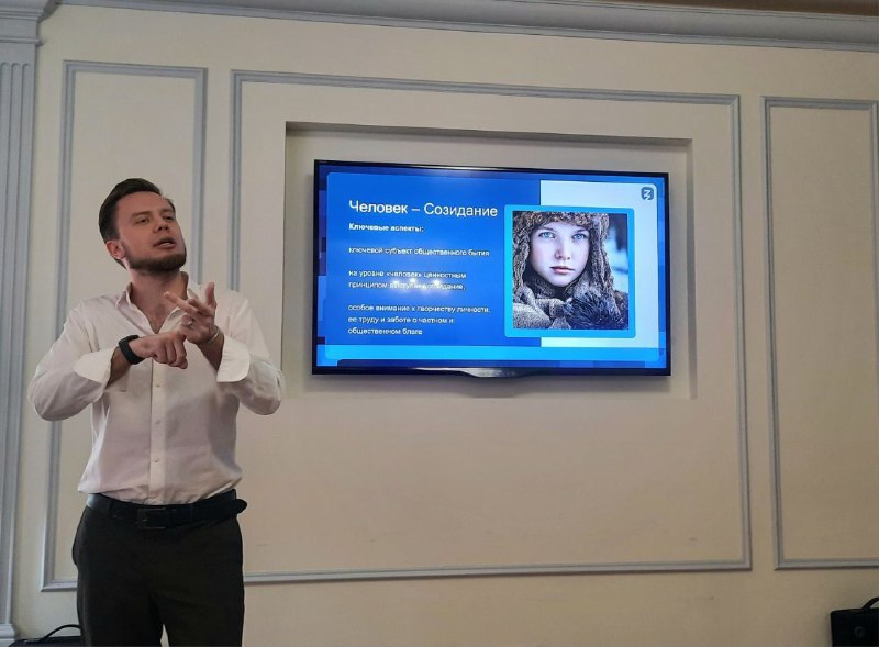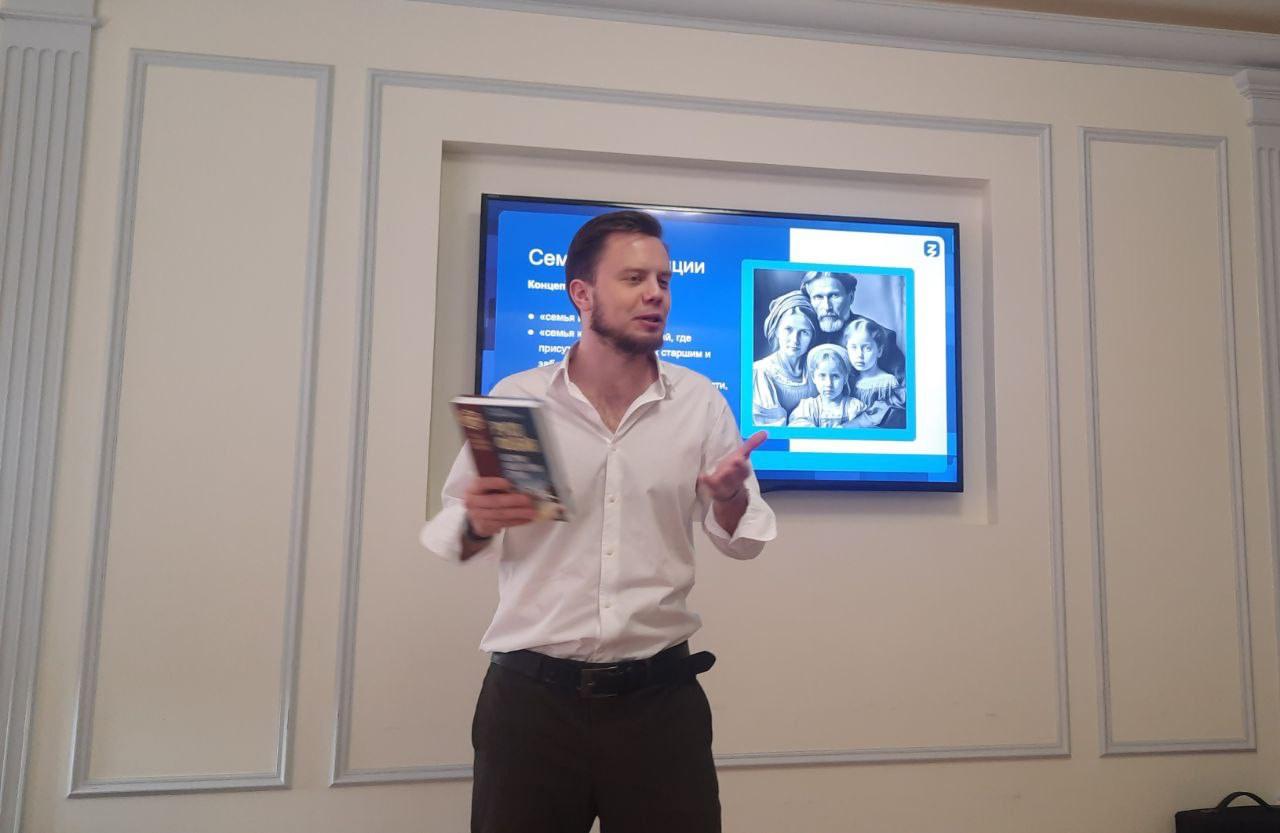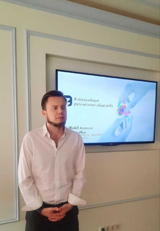 Перед собравшимися выступил Алексей Медведев — историк, педагог и научный сотрудник РГГУ. Он прочитал лекцию на тему «Консолидация российского общества».
