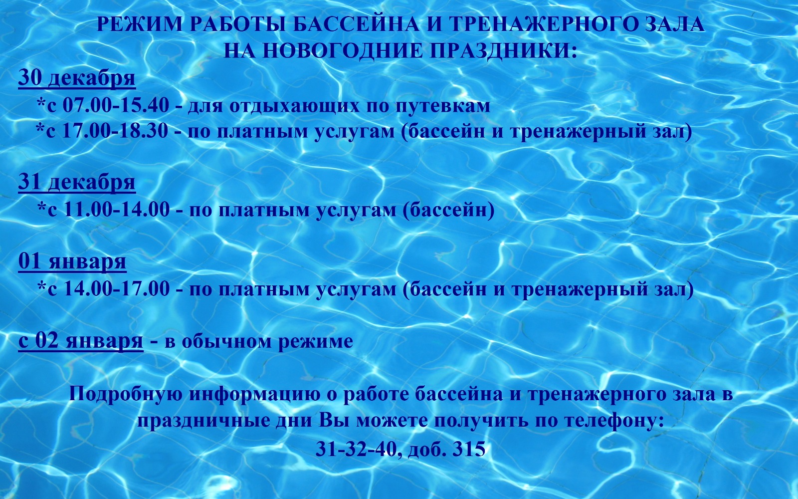 Режим работы плавательного бассейна и тренажерного зала на Новогодние праздники
