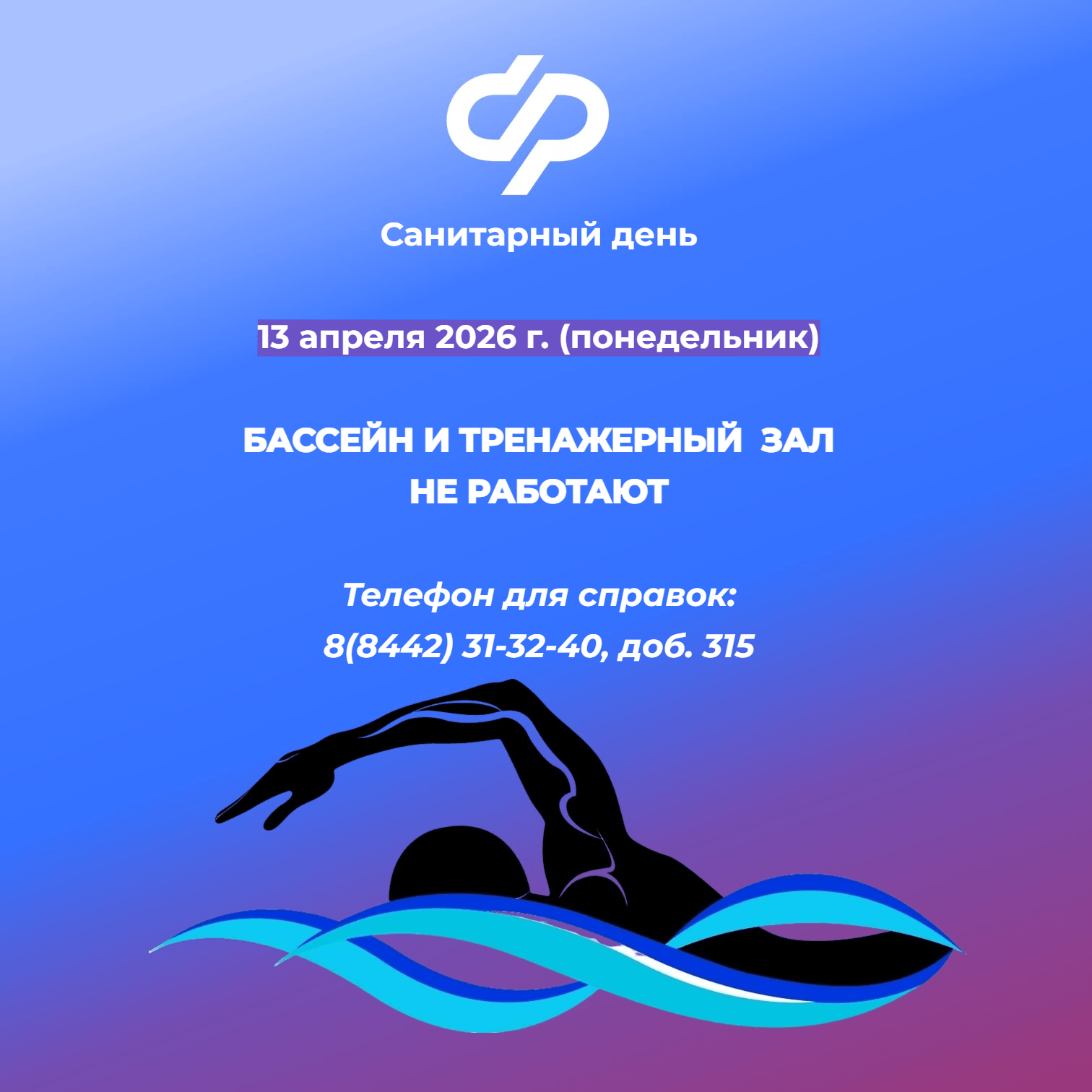 13 апреля 2026г. (понедельник) бассейн и тренажерный зал не будут работать в связи с санитарным днём