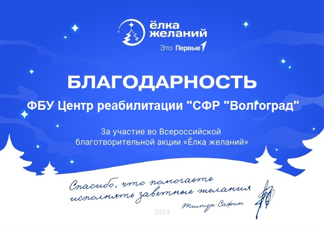 Одним из самых ярких событий в рамках этой акции стало снятие шара с желаниями с новогодней ёлки, которое осуществила директор Центра реабилитации «Волгоград» Черняева Нина Алексеевна. Молодежный совет ФБУ Центра реабилитации СФР «Волгоград» при поддержке руководства исполнил желания двух детей — Ивана и Максима. В дар ребята получили конструктор и развивающий коврик, что вызвало у них бурю эмоций и радостные возгласы.
