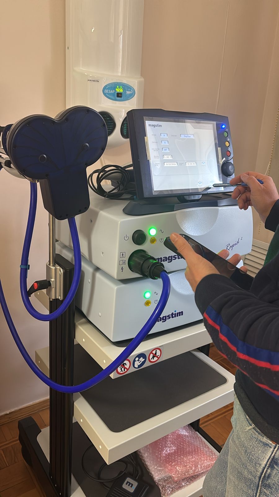 В нашем Центре используется новейший высокочастотный магнитный стимулятор MAGSTIM RAPID. Специализированное лечебное оборудование предназначено для воздействия на нервную систему пациента при помощи импульсов определенной частоты. Данный прибор используется для терапии различных патологий нервной системы у пациентов по программе ОМС и в составе комплексной терапии пострадавших на производстве.
